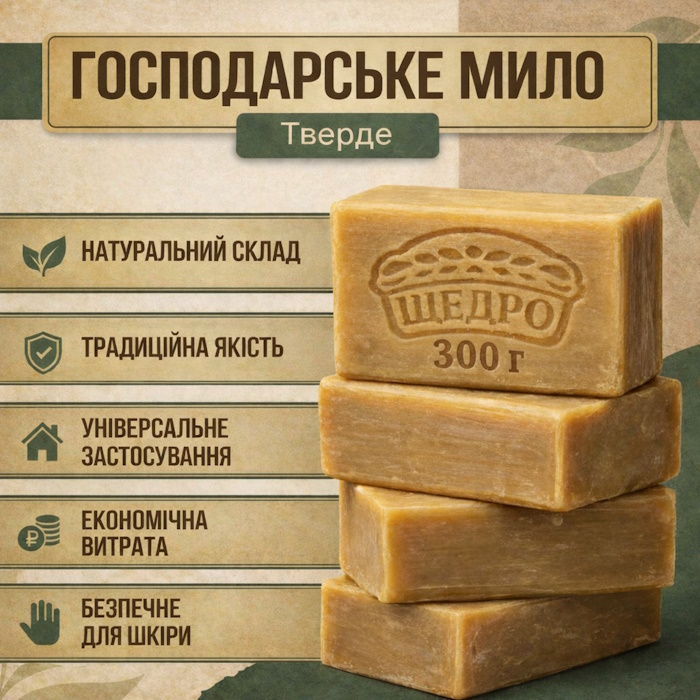 Господарське мило – це перевірений часом, екологічно чистий та безпечний миючий засіб, виготовлений на основі натуральних жирних кислот без додавання ароматизаторів, барвників та синтетичних домішок. Воно є одним з найефективніших і водночас гіпоалергенних засобів для прибирання, прання та дезінфекції.