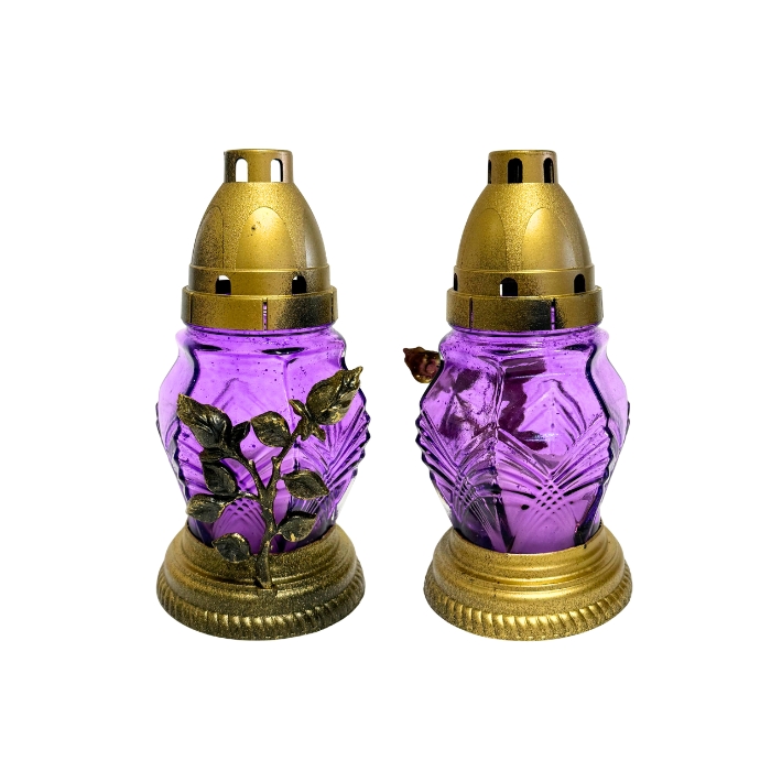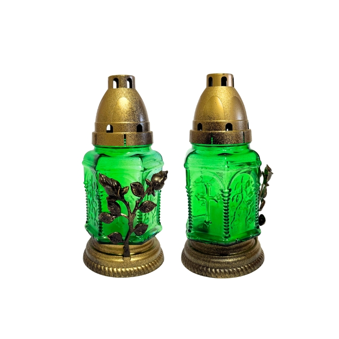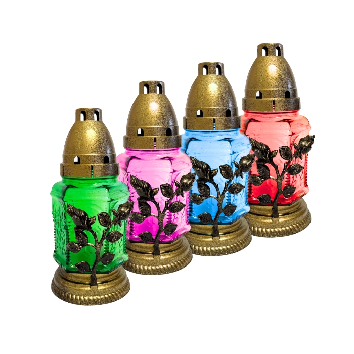 Свічка-лампадка ритуальна скляна призначена для використання на кладовищі, біля пам’ятників або в місцях пам’яті. Лампадки виготовлені зі щільного кольорового скла та мають декоративний пластиковий корпус із релігійною символікою. Пластикова кришка захищає полум’я від вітру та дощу, забезпечуючи стабільне горіння свічки.