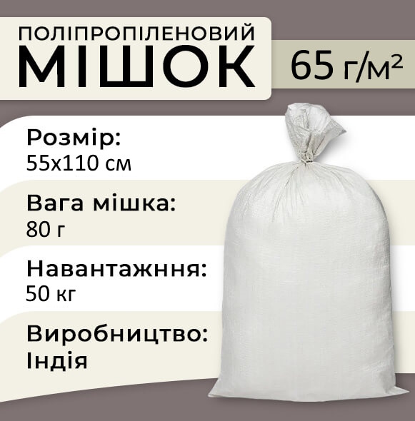 Поліпропіленові мішки розміром 55×110 см і щільністю 65 г призначені для фасування, транспортування та зберігання продукції вагою до 50 кг. Виготовлені з міцного тканого поліпропілену, вони витримують значні навантаження, не рвуться та стійкі до впливу вологи. Підходять для пакування зернових культур, комбікорму, цукру, борошна, а також будівельних матеріалів. Оптимальний варіант для складів, агробізнесу та виробництва.
