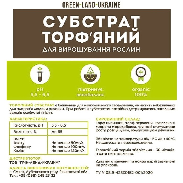Склад: торф низинний, торф верховий, комплексні макро та мікродобрива, ґрунтові стимулятори росту, розпушувачі, водоутримуючі речовини