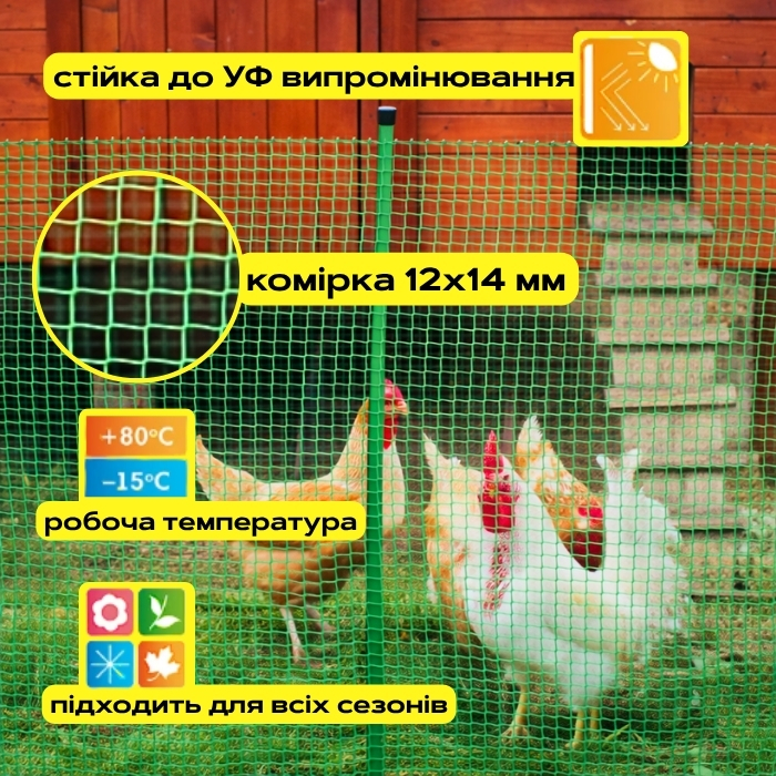 Захисна пластикова сітка з дрібною коміркою 12×14 мм призначена для утримання курчат та іншої дрібної птиці. Завдяки зменшеному розміру осередків забезпечує підвищений рівень безпеки, запобігаючи проникненню хижаків і втечі молодняка. Виготовлена з міцного полімеру, стійкого до вологи, ультрафіолетового випромінювання та перепадів температур. Підходить для облаштування вольєрів, кліток, перегородок і огорож. Легка у монтажі та довговічна у використанні.