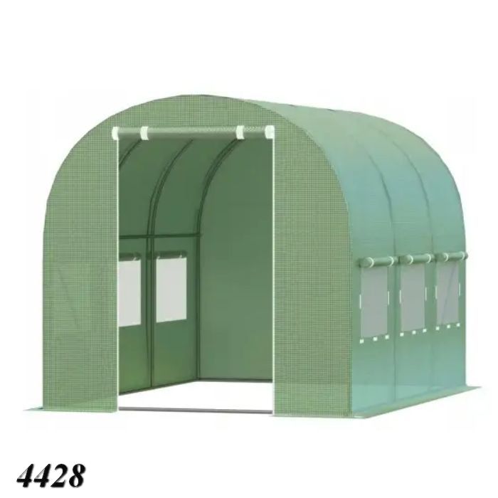 Тунель має 8 вікон з москітними сітками для провітрювання і рулонні дверцята на блискавці. Монтаж здійснюється без фундаменту, а додаткові горизонтальні трубки забезпечують міцність. Ідеально підходить для дачі, городу або присадибної ділянки.