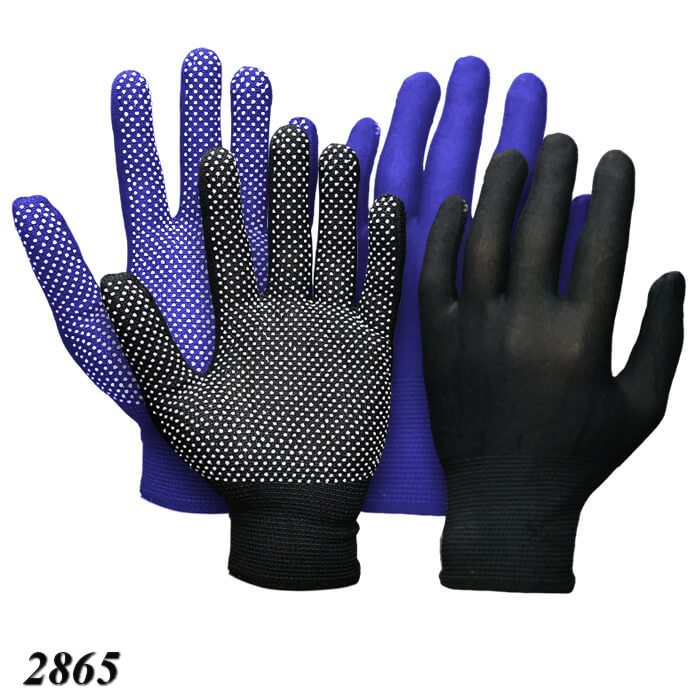 Виготовлені із зносостійкого нейлонового матеріалу різних кольорів з нанесенням ПВХ точок на пальцеву і долонну частину.