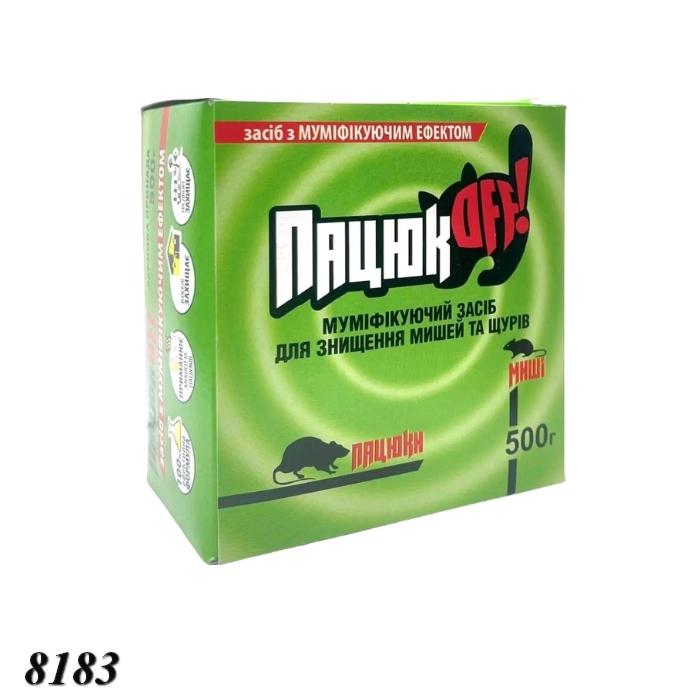 Зернова приманка з ароматом арахісу та сиру, червоного та жовтого кольору Пацюк OFF застосовується для знищення щурів та мишей у житлових та нежитлових приміщеннях, на підприємствах, у медичних закладах, у сховищах та на присадибних ділянках. Пацюк OFF містить у складі діючу речовину – бродифакум. Потрапляючи в організм тварини, цей синтетичний антикоагулянт крові порушує утворення вітаміну K1, необхідного для розвитку білків протромбінового комплексу. Через одну добу після вживання препарату у гризуна різко знижується рівень зсідання крові. Внаслідок цього будь-яке пошкодження гризуна призводить до внутрішньої кровотечі та загибелі тварини протягом 1-7 днів. Через відстрочену дію родентициду у гризунів не виникає різко виражених симптомів отруєння, що не викликає підозри та реакції страху приманки в інших особин. Засіб має у складі ароматизатори, що приманюють, і смакові компоненти, а також муміфікатор, який позбавить від неприємного запаху загиблих гризунів.