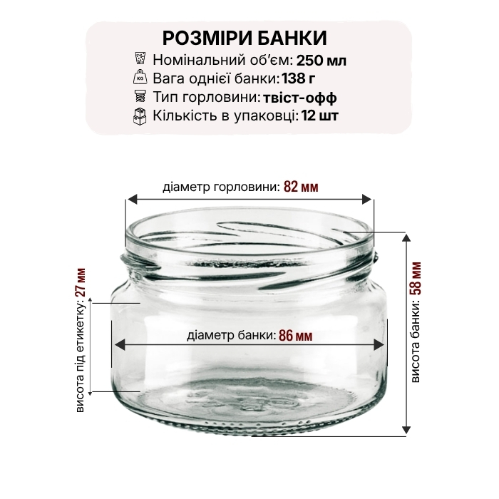Циліндрична скляна банка об’ємом до 250 мл із класичним вінчиком ТО 82 мм. Прозоре харчове скло дозволяє чітко контролювати колір і структуру вмісту, а рівні стінки забезпечують акуратне наклеювання етикетки. Ідеально підходить для домашньої та промислової консервації ікри, рибних салатів, паштетів, соусів та делікатесних закусок. Банка витримує багаторазову стерилізацію й пастеризацію, гарантує герметичне закриття кришкою.