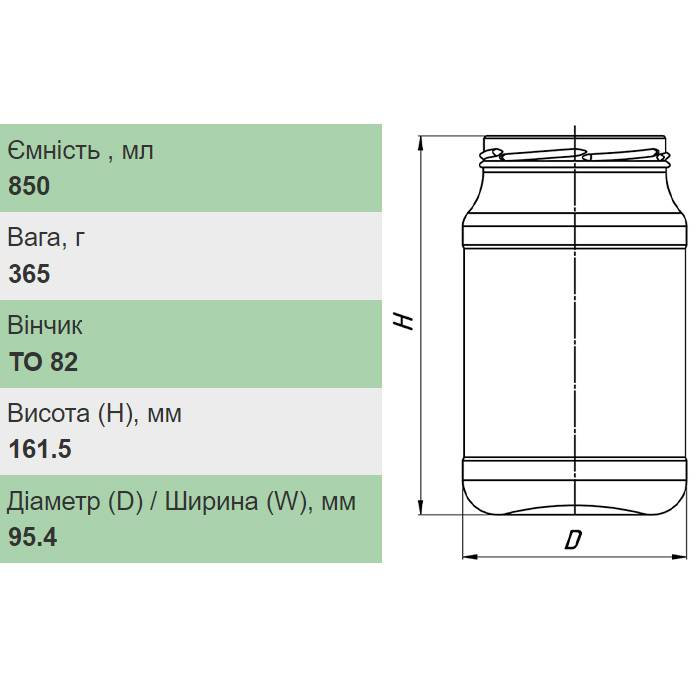 Скляна банка об’ємом 850 мл із стандартним вінчиком ТО 82 мм. Виготовлена з харчового прозорого скла, що витримує багаторазову стерилізацію та пастеризацію. Циліндрична форма дозволяє економити місце на полиці й акуратно викладати заготовки. Ідеально підходить для джемів, соусів, меду, кондитерських кремів, солінь та дегустаційних зразків. Банка забезпечує герметичне закриття гвинтовою кришкою й зберігає смакові та ароматичні властивості продукту.
