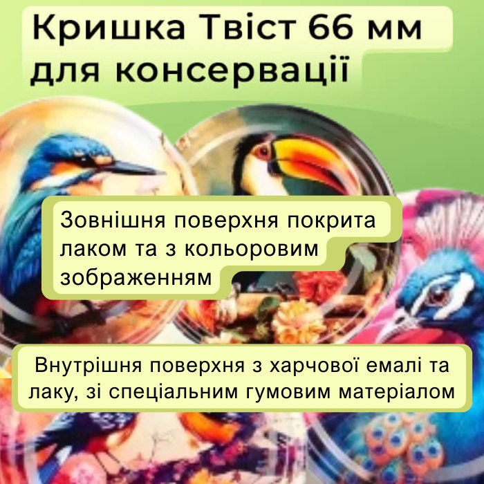 Металеві ЄВРО кришки діаметром 66 мм — виготовлені зі сталі з полімерним внутрішнім покриттям (харчова емаль), що забезпечує захист продуктів від контакту з металом та продовжує термін зберігання. Тип закручування – «твіст-оф», що дозволяє герметично закривати банки вручну без додаткових інструментів. Ідеально підходять як для побутової консервації, так і для промислового пакування в оптових обсягах.Кришка витримує температуру до 100 °C.