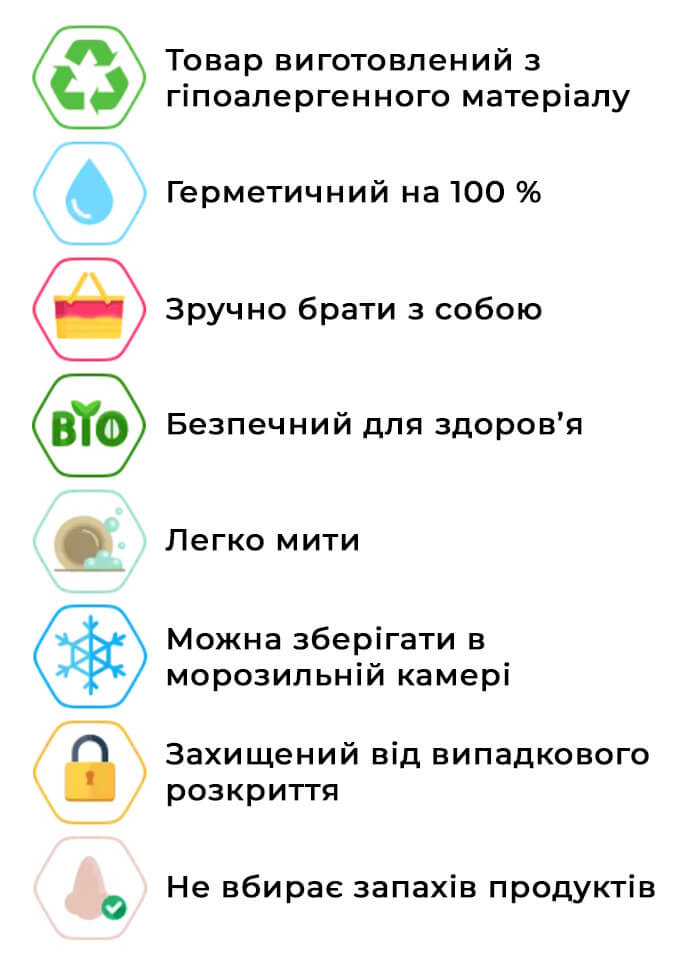 Контейнери багаторазового використання виготовляються з міцного харчового поліпропілену та призначені для зберігання їжі в холодильнику, морозильній камері. Крім того, вони підходять для розігрівання продуктів в мікрохвильовій печі.