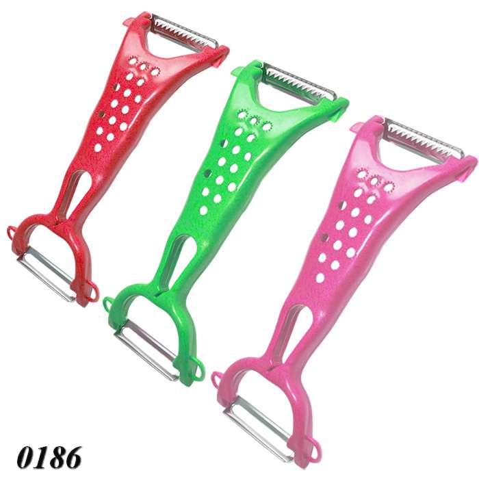 Ніж-овочечистка двосторонній — це зручний кухонний інструмент для швидкого та акуратного очищення овочів і фруктів. Гострі леза з нержавіючої сталі легко зрізають шкірку з картоплі, моркви, огірків, яблук та інших продуктів. Ергономічна ручка забезпечує комфортне утримання навіть при тривалому використанні. Ідеально підходить для щоденного використання на кухні.