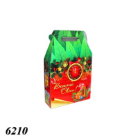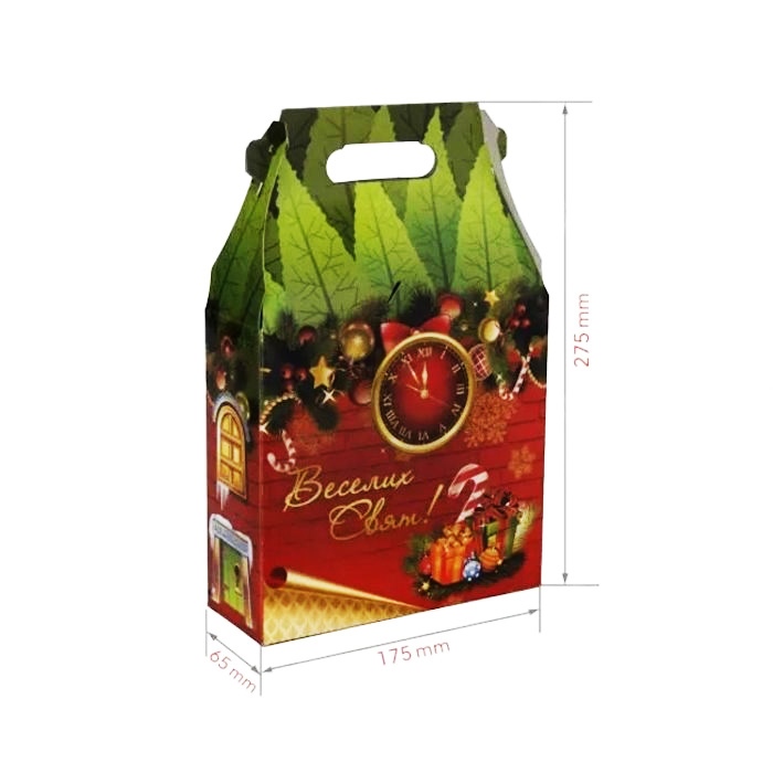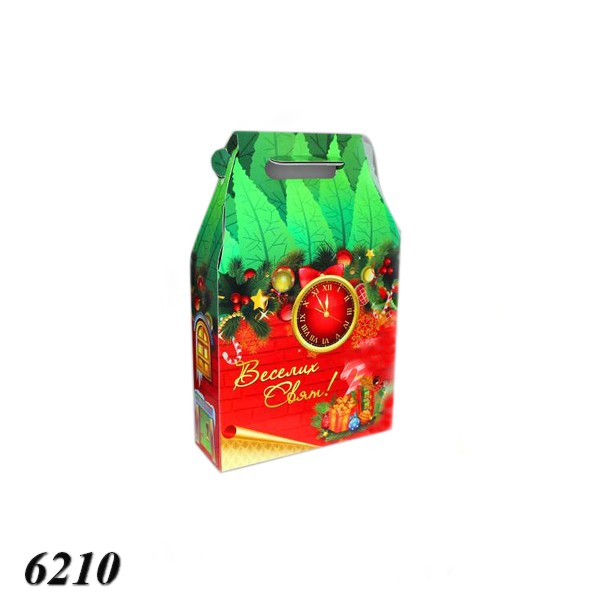 Ця новорічна коробка середнього розміру з ручкою має класичний червоно-зелений дизайн. На ній зображені годинник та святкові гірлянди, що додає атмосфері чарівності. Коробка відмінно підходить для зберігання солодощів або маленьких подарунків. Вміщує до 700 г солодощів.