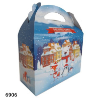 Ця коробка виконана в яскравих зимових кольорах із зображенням сніговика, пінгвіна та святкових будиночків. З іншої сторони, зображений Санта на самокаті. Вона чудово підходить для солодощів та невеликих новорічних подарунків. Вміщує до 1400 г солодощів