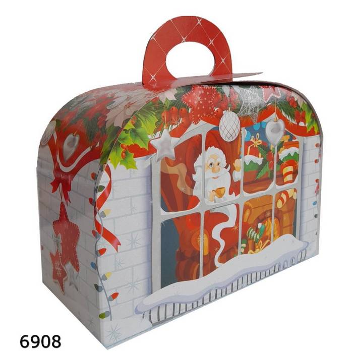 Ця новорічна коробка має форму валізки з ручкою та прикрашена зображенням зимового вікна з Сантою, новорічними прикрасами та теплими світловими елементами. Вона ідеально підходить для пакування солодощів або подарунків. Вміщує до 900 г солодощів.