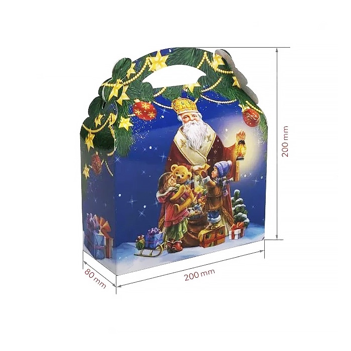 Подарункова новорічна коробка «Святий Миколай» об’ємом 1100 г — чудове рішення для упаковки солодощів, дитячих подарунків або невеликих сувенірів до Дня Святого Миколая, Нового року чи Різдва. Яскравий дизайн із зображенням Святого Миколая у традиційному українському стилі створює особливий настрій і додає подарунку святковості.