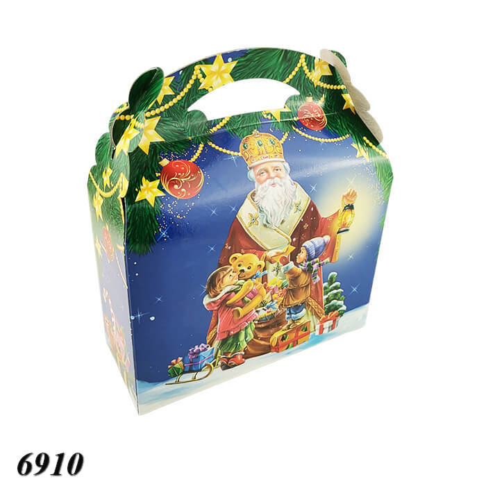 Коробка виготовлена з міцного картону, що добре тримає форму та захищає вміст під час транспортування. Завдяки зручній ручці її легко переносити, що особливо важливо для дитячих свят і новорічних корпоративів.