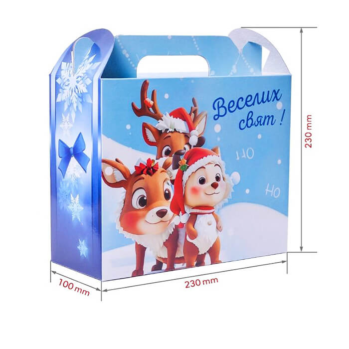 Новорічна коробка «Саквояж» з ручками та святковим малюнком оленів, розрахована на 1500 г цукерок. Виконана зі щільного картону, має зручні ручки для перенесення й яскравий дизайн у новорічній тематиці. Ідеально підходить для дитячих, сімейних та корпоративних подарунків.