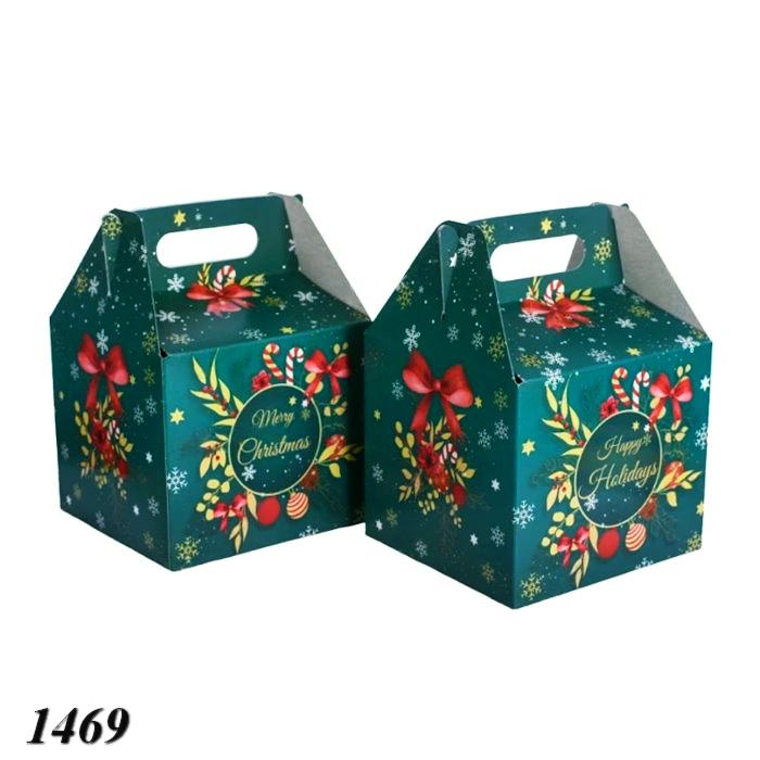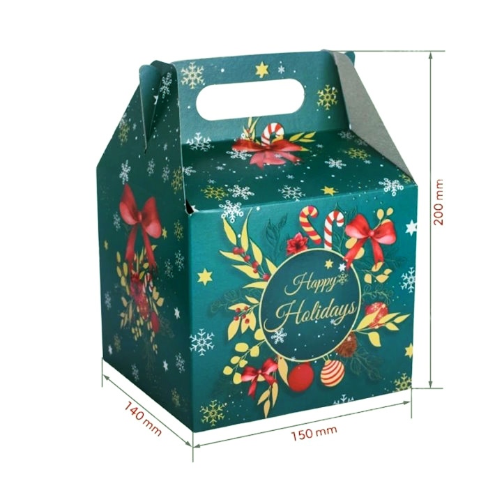 Новорічна коробка у формі куба зеленого кольору з ручкою. Місткість до 1000 г цукерок. Щільний картон та яскравий святковий дизайн роблять її ідеальною упаковкою для дитячих і корпоративних подарунків. Зручна ручка дозволяє легко переносити коробку.