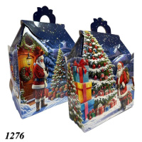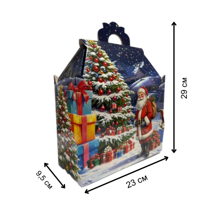 Новорічна коробка «Санта біля ялинки» для солодких подарунків вагою до 1000 г. Виготовлена з міцного картону, прикрашена яскравим зимовим малюнком із зображенням Санти та ялинки. Ідеально підходить для дитячих свят і корпоративних подарунків.