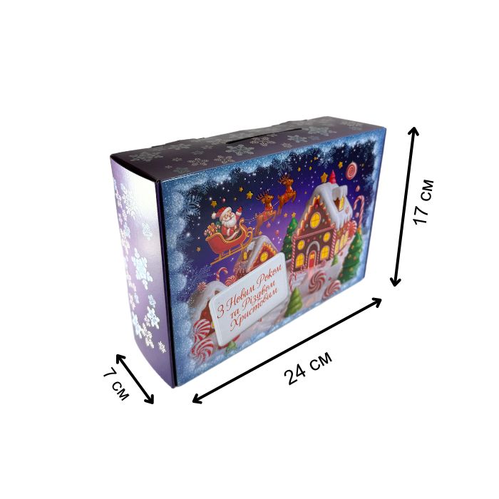 Новорічна коробка моноблок фіолетового кольору для солодких подарунків вагою до 900 г. Виготовлена з щільного картону, має зручну цільну конструкцію, яка добре тримає форму. Святковий дизайн робить її ідеальною для дитячих і корпоративних подарунків.