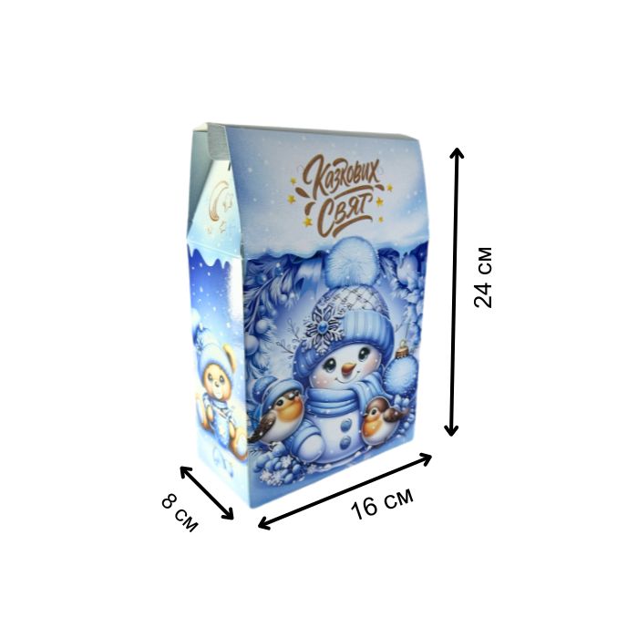 Новорічна коробка у формі сумки, блакитного кольору, для солодких подарунків вагою до 800 г. Зручна у використанні, виготовлена з щільного картону та прикрашена святковим зимовим дизайном. Ідеально підходить для дитячих і корпоративних подарунків.
