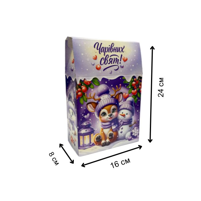 Новорічна коробка у формі сумки, фіолетового кольору, для солодких подарунків вагою до 800 г. Зручна у використанні, виготовлена з щільного картону та прикрашена святковим зимовим дизайном. Ідеально підходить для дитячих і корпоративних подарунків.