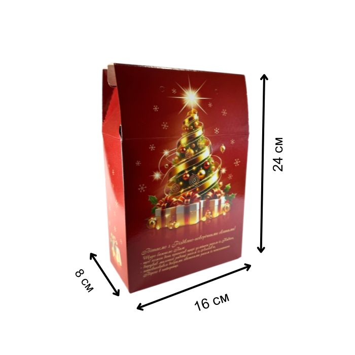 Новорічна коробка у формі сумки, червоного кольору, для солодких подарунків вагою до 800 г. Зручна у використанні, виготовлена з щільного картону та прикрашена святковим зимовим дизайном. Ідеально підходить для дитячих і корпоративних подарунків.