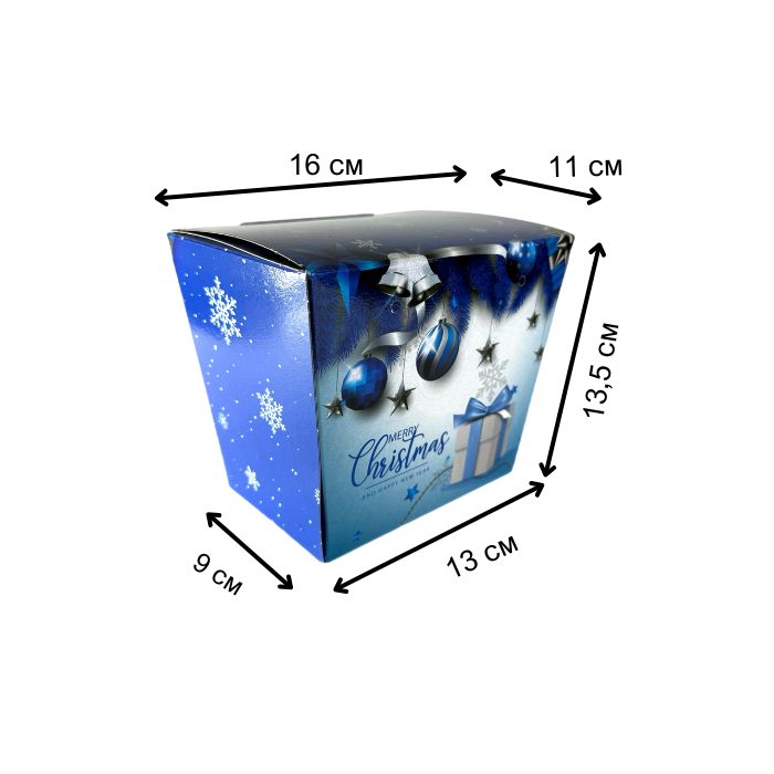 Новорічна коробка синього кольору для солодких подарунків. Розрахована на 700 г цукерок. Виконана з щільного картону, прикрашена святковими зимовими мотивами. Ідеальний варіант для дитячих, сімейних і корпоративних подарунків.