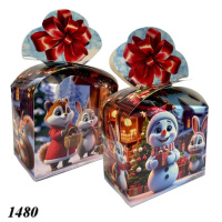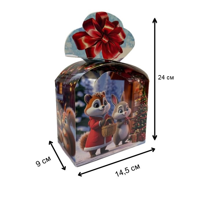 Новорічна коробка з малюнком лісових звірів, розрахована на солодощі вагою до 500 г. Яскравий святковий дизайн створює атмосферу зимової казки. Коробка виготовлена з міцного картону та підходить для дитячих і сімейних подарунків.