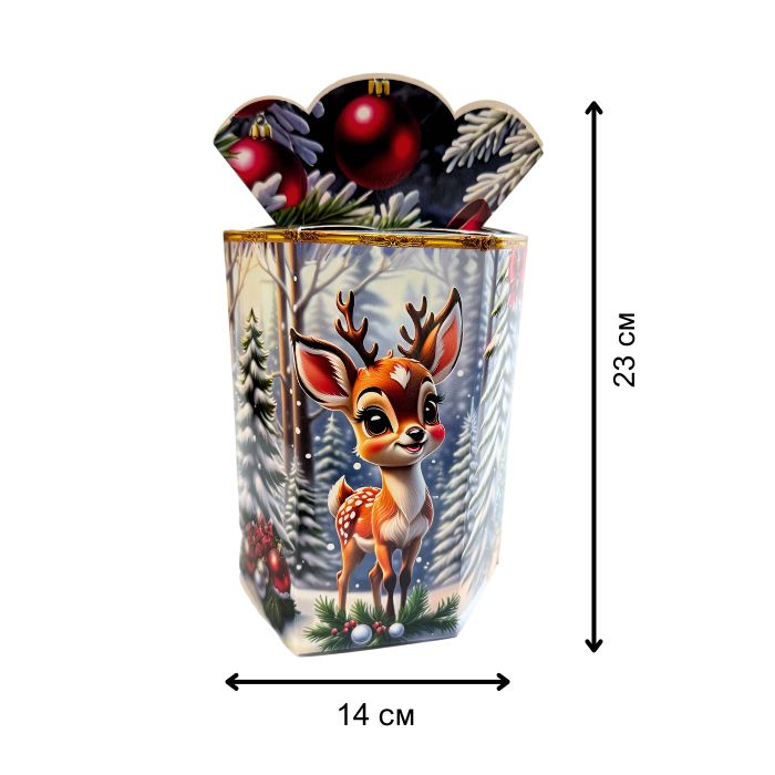 Новорічна коробка «Їжачок та олень» для солодких подарунків вагою до 800 г. Яскравий святковий дизайн із зображенням казкових тварин створює зимову атмосферу. Коробка виготовлена з міцного картону, зручна у використанні та надійна для подарунків.