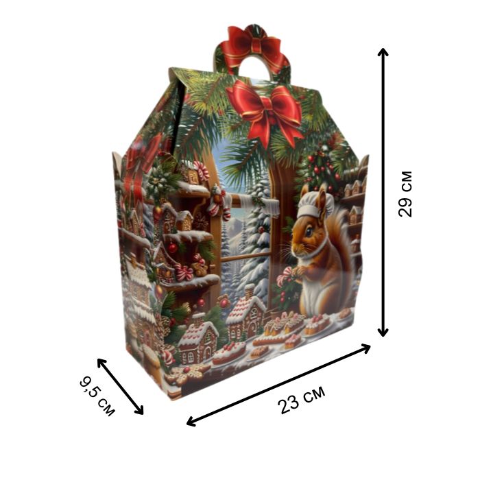 Новорічна коробка «Білочки» для солодких подарунків вагою до 1000 г. Виготовлена з міцного картону та прикрашена яскравим малюнком з білочками, що створює атмосферу зимової казки. Ідеально підходить для дитячих свят, сімейних та корпоративних подарунків.