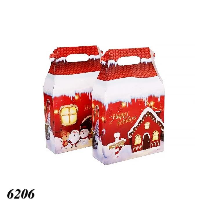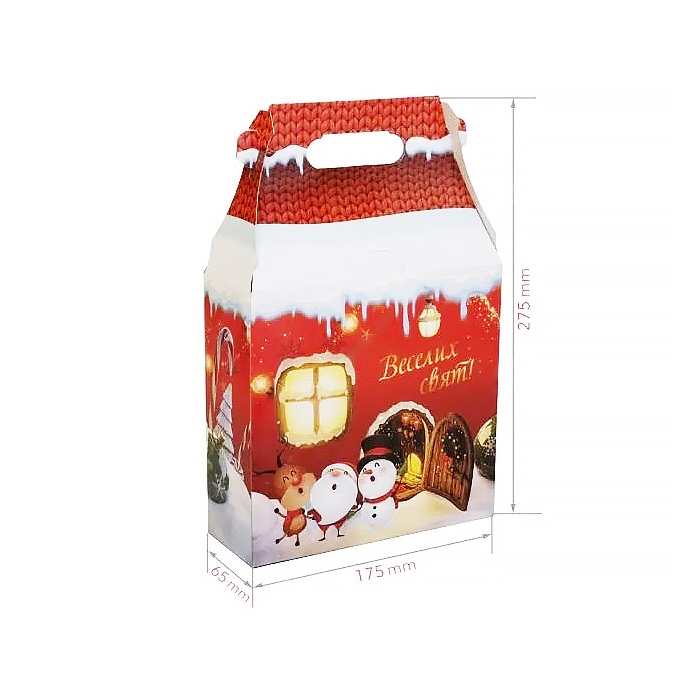 Ця новорічна коробка має вертикальну форму із ручкою та зображенням різдвяного будинку. Яскраві кольори та деталі створюють атмосферу тепла і радості. Ідеальна для пакування святкових солодощів. Вміщує до 700 г солодощів.
