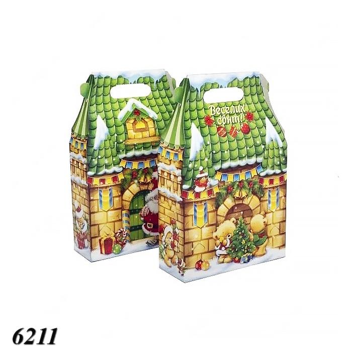 Новорічна коробка «Замок» на 700 г — яскраве та оригінальне пакування у формі казкового замку. Ідеально підходить для новорічних подарунків дітям та дорослим. Міцний картон із барвистим святковим дизайном надійно зберігає солодощі, створюючи атмосферу казки.