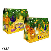 Коробка з яскравим новорічним дизайном з ялинковими прикрасами чудово підійде для пакування солодощів. Святкова тематика та міцний матеріал роблять її відмінним вибором для подарунка. Вміщує до 1000 г солодощів.