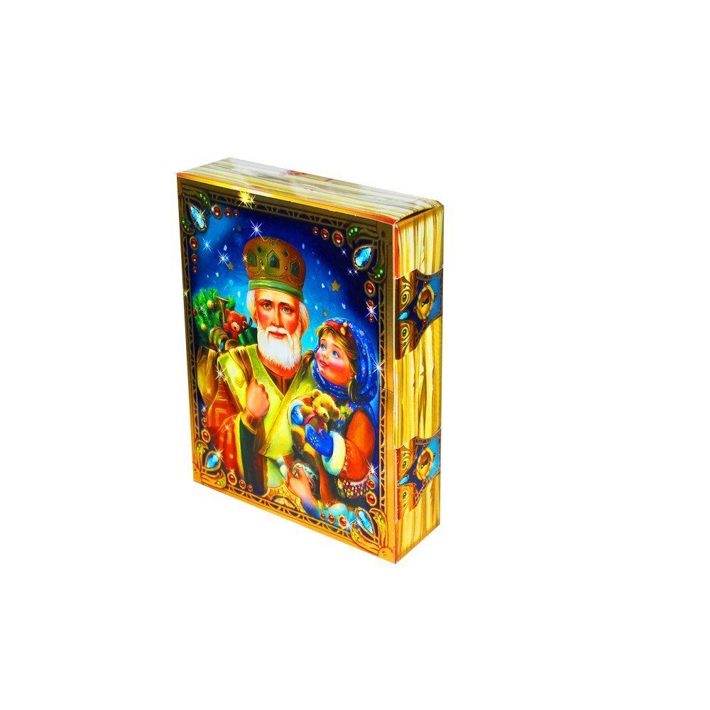 Для створення казкового подарунка підійде новорічна упаковка Книга Св.Миколай, вона виготовлена з високоякісного глянцевого картону, на який нанесено яскравий повноколірний новорічний малюнок. Така новорічна коробка має прямокутну форму та об’єм 800 грам.