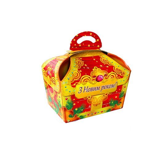 Для створення казкового подарунка підійде новорічна упаковка Сундук з гілочками, вона виготовлена з високоякісного глянцевого картону, на який нанесено яскравий повноколірний новорічний малюнок. Така новорічна коробка має квадратну форму та об’єм 400 грам.