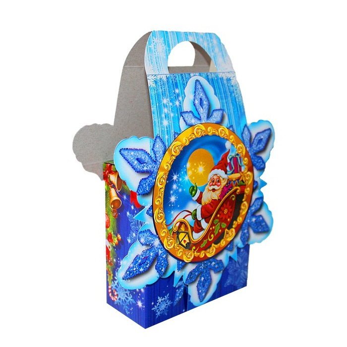 Для створення казкового подарунка підійде новорічна упаковка Сніжинка, вона виготовлена з високоякісного глянцевого картону, на який нанесено яскравий повноколірний новорічний малюнок. Така новорічна коробка має квадратну форму та об’єм 200 грам.