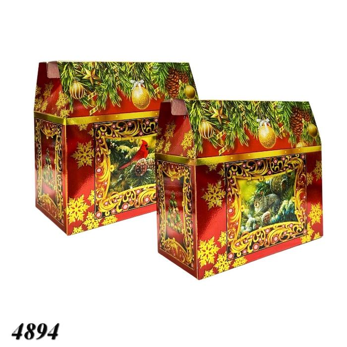 Ця червона коробка з ялинковими прикрасами та пейзажами створює затишний святковий настрій. Ідеальний вибір для новорічного подарунка у вигляді цукерок. Вміщує до 1000 г солодощів.