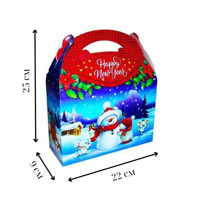Коробка виготовлена з щільного картону, який добре тримає форму та захищає вміст. Яскравий зимовий малюнок із веселим сніговиком створює святковий настрій. Після свят таку коробку можна використовувати для зберігання дрібниць або як декоративний елемент у дитячій кімнаті.
