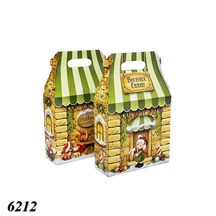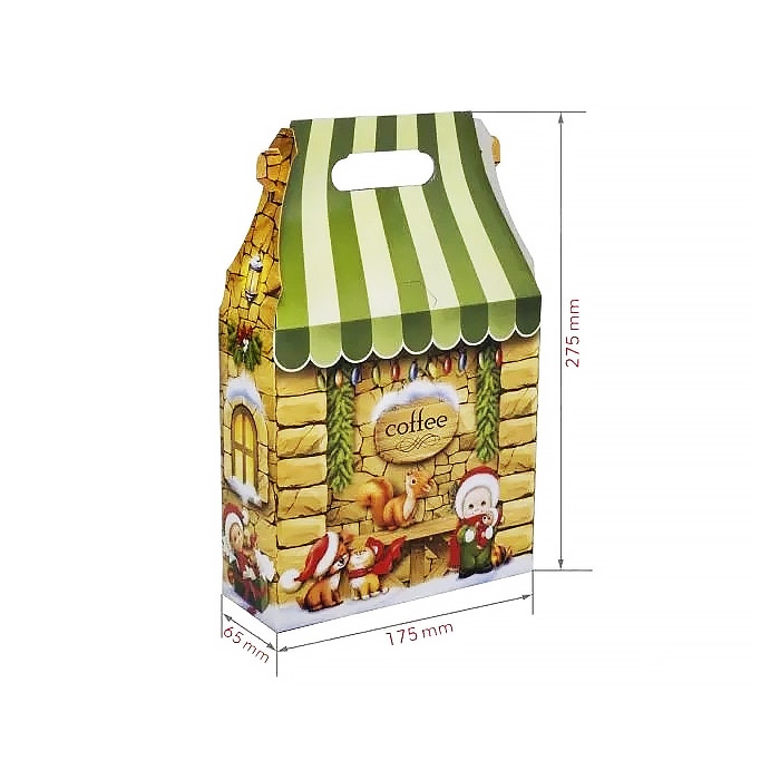 Коробка у вигляді казкового будиночка з зеленим дахом і казковими мотивами створить чарівну атмосферу на будь-якому святі. Вона стане ідеальним подарунковим пакуванням для новорічних солодощів. Вміщує до 700 г солодощів.