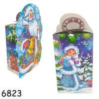Ця новорічна коробка виконана у вигляді чарівної сцени зі Снігуронькою та Дідом Морозом. Вона має незвичайну форму з вирізами по контуру персонажів. Яскраві кольори та зимовий фон додають атмосферу святкового настрою. Вміщує до 700 г солодощів.