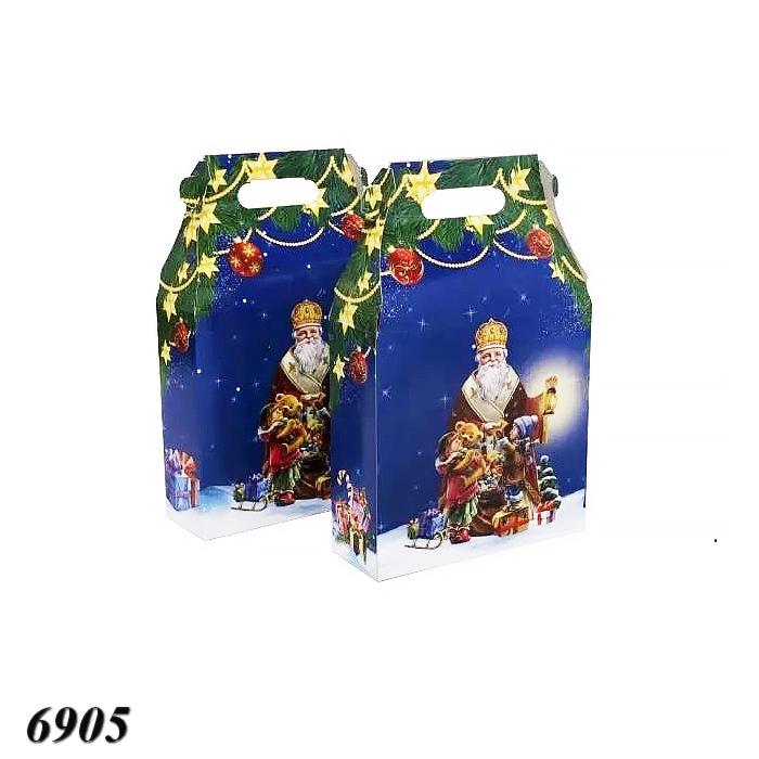 Ця коробка з ручкою прикрашена яскравим зображенням Миколая зі святковими подарунками на синьому фоні. Ідеальна для солодощів або невеликих подарунків на різдво. Вміщує до 700 г солодощів.
