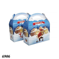 Ця коробка виконана в яскравих зимових кольорах із зображенням сніговика, пінгвіна та святкових будиночків. З іншої сторони, зображений Санта на самокаті. Вона чудово підходить для солодощів та невеликих новорічних подарунків. Вміщує до 1400 г солодощів
