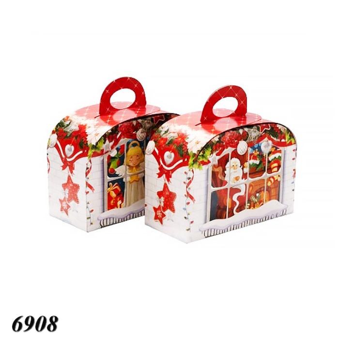 Ця новорічна коробка має форму валізки з ручкою та прикрашена зображенням зимового вікна з Сантою, новорічними прикрасами та теплими світловими елементами. Вона ідеально підходить для пакування солодощів або подарунків. Вміщує до 900 г солодощів.