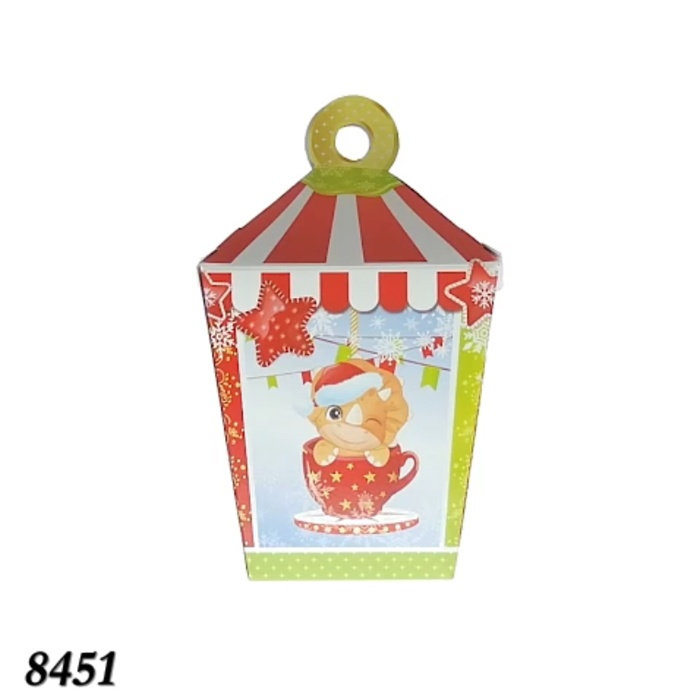 Коробка виготовлена з міцного картону, добре тримає форму і захищає вміст. Завдяки формі ліхтарика та зручній ручці її легко переносити. Після свят таку упаковку можна використовувати для зберігання дрібниць або як декоративний елемент у дитячій кімнаті.