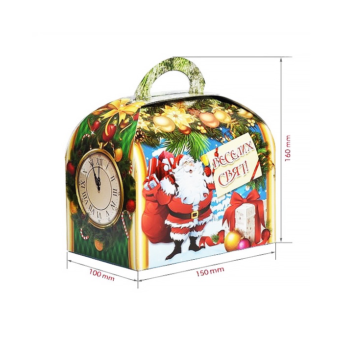 Коробка виготовлена з міцного ламінованого картону, який надійно тримає форму та захищає вміст від пошкоджень. Кришка щільно фіксується, а зручна ручка дозволяє легко переносити подарунок. Святковий принт із акцентом на годинник символізує мить зустрічі Нового року і дарує атмосферу очікування дива.