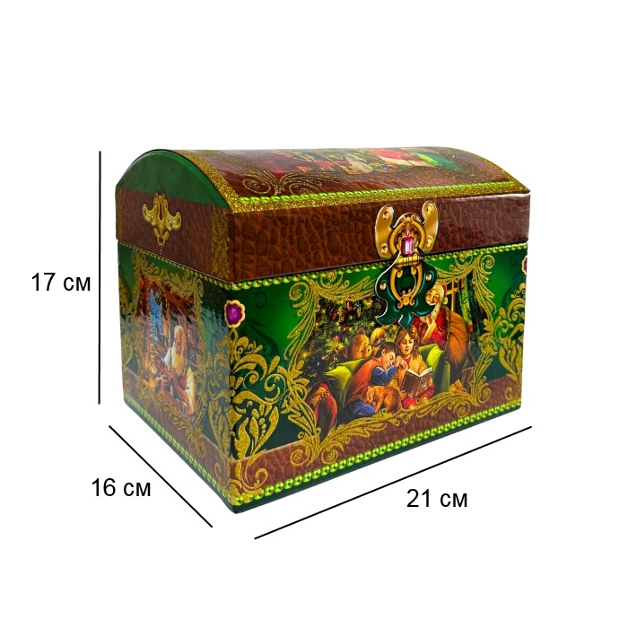 Новорічна упаковка " Скриня". Коробка розрахована на 1 кг цукерок. Коробка з палітурного картону, обклеєна ламінованим папером з повно кольоровим друком та вибірковим глітернім лаком. Купити новорічну коробку Ви можете оптом і в роздріб. Різноманітний дизайн коробок підійде для поздоровлення на різдвяні, новорічні свята, а також до Дня Святого Миколая.