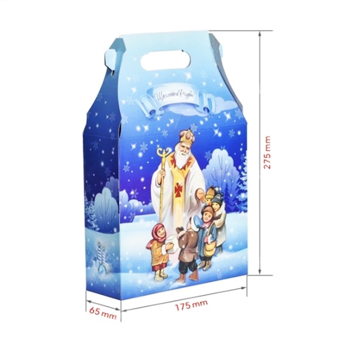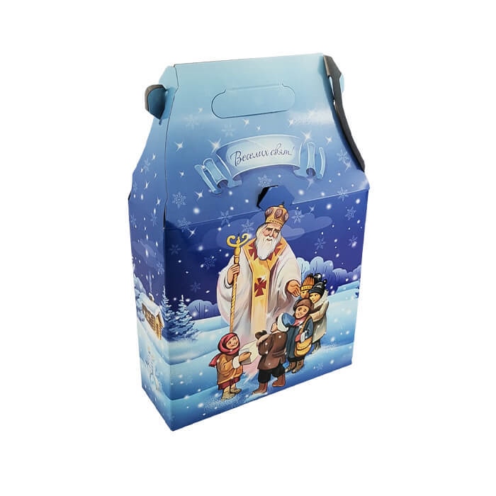 Новорічна коробка «Миколай на снігу» для солодких подарунків. Місткість — 700 г цукерок. Виконана зі щільного картону, має святковий дизайн із зображенням Святого Миколая на зимовому фоні. Чудовий вибір для дитячих, сімейних і корпоративних подарунків.