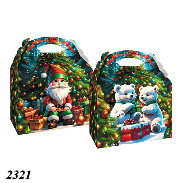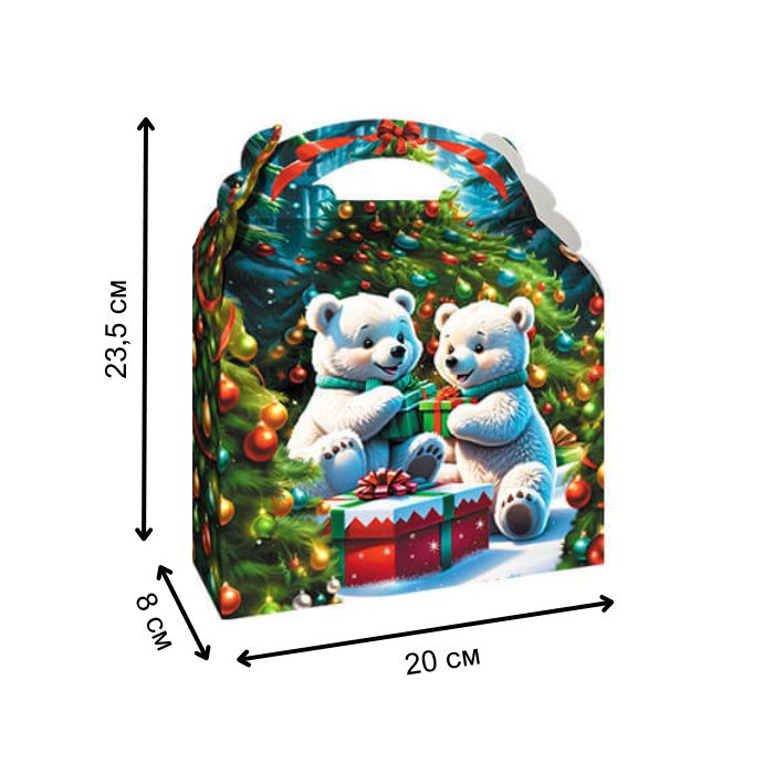 Коробка з яскравим святковим дизайном: на одній стороні веселий гном, на іншій — білі ведмежата біля ялинки. Чудовий варіант для подарунка на Різдво або Новий рік, додає святкового настрою та вміщує до 800 г солодощів.