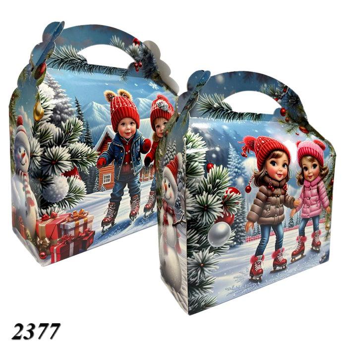 Новорічна коробка “Діти на ковзанах” — святкове пакування з барвистим зимовим сюжетом. На зображенні діти у теплих шапках катаються на ковзанах серед засніжених ялинок та сніговика. Міцний картон витримує вагу солодощів, а зручна ручка робить коробку практичною для перенесення. Ідеально підходить для подарунків, сувенірів чи солодких наборів.