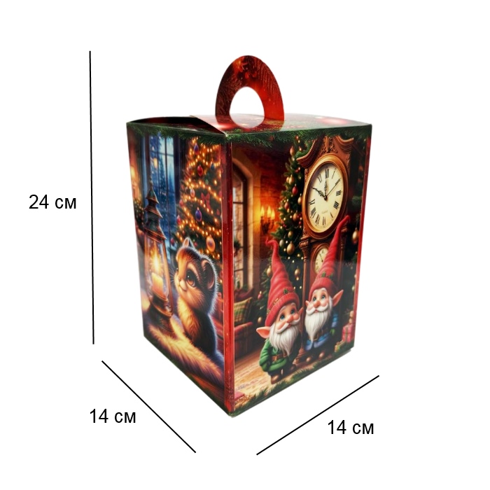 Новорічна коробка «Затишний вечір» розрахована на фасування до 1000 г солодощів. Виготовлена з якісного щільного картону, має зручну ручку для перенесення та барвисте святкове оформлення. Дизайн коробки передає атмосферу тепла та затишку зимових свят, що робить подарунок ще приємнішим. Ідеально підходить для упаковки цукерок, печива, наборів солодощів та невеликих подарунків
