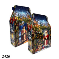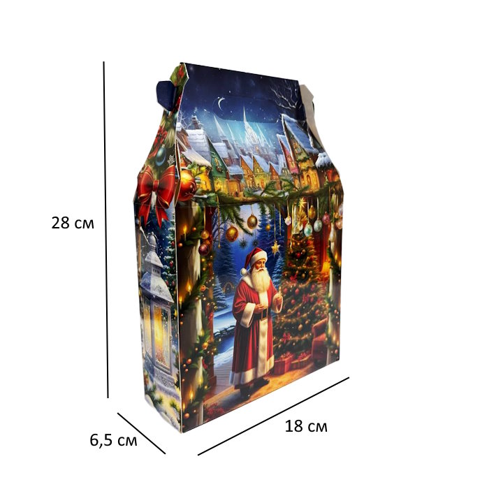 Новорічна подарункова коробка "Санта" — святкова упаковка для солодощів та невеликих подарунків. Виконана з міцного картону з барвистим зимовим дизайном, на якому зображено Санту біля ялинки. Створює теплу та радісну атмосферу свята, ідеально підходить для Різдва та Нового року.